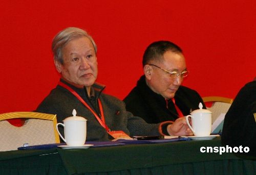 著名導(dǎo)演謝飛(左)、中影集團(tuán)董事長韓三平在主席臺(tái)就坐。 中新社發(fā) 黃寧 攝
