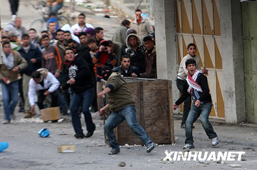 12月27日,在約旦河西岸城鎮(zhèn)希伯倫,巴勒斯坦人向以色列士兵投擲石塊。當(dāng)日,上百名巴勒斯坦人在希伯倫抗議以軍空襲加沙,并與以色列士兵發(fā)生沖突。新華社記者 殷博古 攝