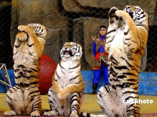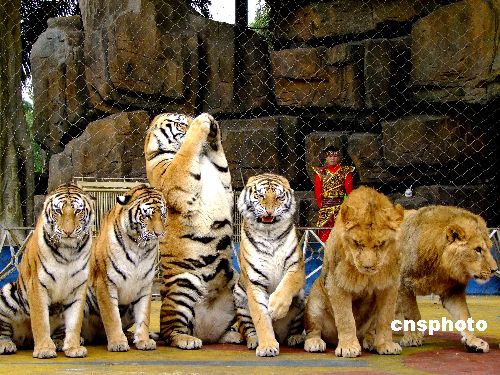 2009年1月29日,廣西南寧動物園的老虎獅子在馴獸員的引導(dǎo)下,直立起來,為游人作揖。還集體排隊走大圈,寓意祝游人“行大運”。