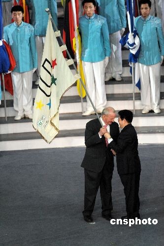 哈爾濱市市長(zhǎng)張效廉把大冬會(huì)會(huì)旗交給國(guó)際大體聯(lián)主席喬治·基里安。