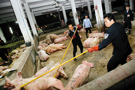25日,天河區(qū)動防所透露,在天河牲畜交易市場來自河南新鄉(xiāng)孟津的149頭生豬中,已明確查出17頭含有“瘦肉精”。25日晚,動檢人員用高壓電擊將這149頭生豬電死后,送上衛(wèi)生處理車,運往廣州市衛(wèi)生處理廠作無公害處理。而天河牲畜市場43戶檔主,已集體寫好“不要關閉市場”的訴求書,擇日遞交到政府有關部門。