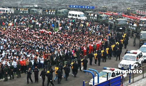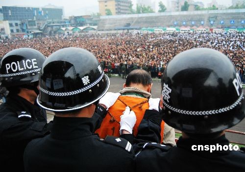 2009年3月26日,湖南省郴州市在東風(fēng)廣場召開公捕公判大會,對一批犯罪嫌疑人和犯罪分子進行公開刑拘、逮捕和判決,對罪行極其嚴重的犯罪分子判處死刑。 中新社發(fā) 賀茂峰 攝
