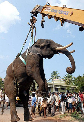 4月1日,印度喀拉拉邦一頭公象在交通繁忙的公路上被一輛卡車撞到,兩條后腿骨折和背部受傷,獸醫(yī)不得不動用起重機(jī)來搬運這個“龐然大物”。據(jù)報道,這頭大象高9英尺(約2.7米),重達(dá)6噸,剛剛從附近的一家印度教寺廟逃出。在事發(fā)現(xiàn)場,數(shù)百名觀眾正在觀看獸醫(yī)如何救治受傷的大象和如何將它搬離現(xiàn)場。一名獸醫(yī)表示,這頭大象體型龐大,情緒極不穩(wěn)定。不過,它此前一直生活在附近人來人往的寺廟,所以對人并不十分恐懼。在對大象做過全面評估后,他們決定從附近的建筑工地上征用一輛起重機(jī),將這頭大象吊到卡車上,將它運往一家獸醫(yī)醫(yī)院。據(jù)悉,搬運工作進(jìn)展得十分順利。不過,令人可悲的是,盡管獸醫(yī)在努力救治這頭大象,但由于它的傷勢過于嚴(yán)重,于當(dāng)天晚間死去。