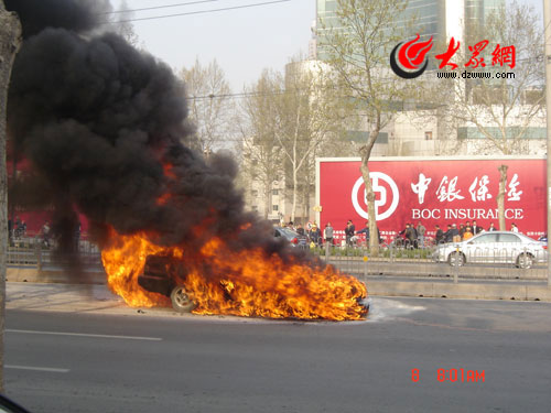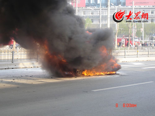 8日早7:50,濟(jì)南市歷山路與和平路路口,一輛轎車在行駛途中突然爆燃,熊熊大火和濃煙頓時(shí)彌漫方圓數(shù)十米,迅速而來的消防人員2分鐘撲滅大火,自燃轎車已經(jīng)面目全非,只剩框架,所幸并無人員傷亡。記者用手機(jī)拍下了整場(chǎng)火災(zāi)的全過程。
