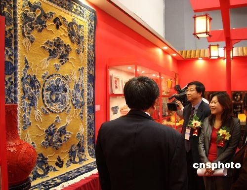 “海峽兩岸文化創(chuàng)意產(chǎn)業(yè)展”四月二十三日在臺北世貿(mào)一館開幕。北京市派出二十多位工藝大師和七十多人的參展團,展位布置之精美,令臺北同行驚嘆。圖為臺北市文化局長李永萍(右一)在觀賞北京地壇五廠編制的“盤金絲毯”。這種用純金與羊毛編織的地毯的工藝已失傳百年,工藝大師曹艷紅在研究北京故宮珍藏的皇家地毯后,破譯了此特種工藝。中新社發(fā) 耿軍 攝