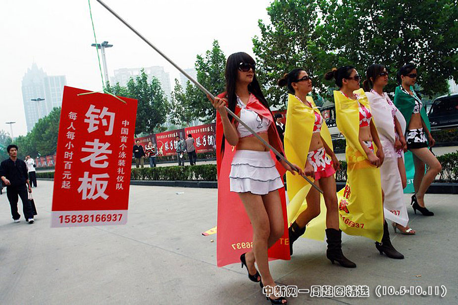 10月9日,鄭州國際會(huì)展中心附近5名身穿性感泳裝的美女模特,在這里釣起“老板”。來源:CFP