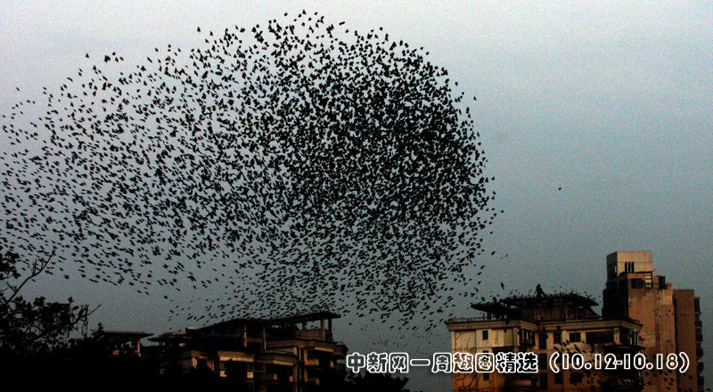 10月16日傍晚,近萬只椋鳥在湖北省武漢動(dòng)物園樹林上空及旁邊居民小區(qū)旁飛翔,嘰嘰喳喳,熱鬧非凡,場(chǎng)面蔚為壯觀。圖片來源:CFP