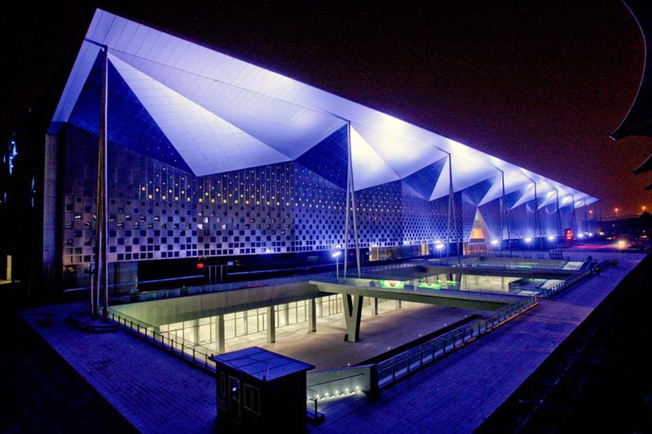 12月30日,隨著世博臨近世博園工地一片繁忙景象,夜間黃浦江畔世博各主場館進行燈光調試。