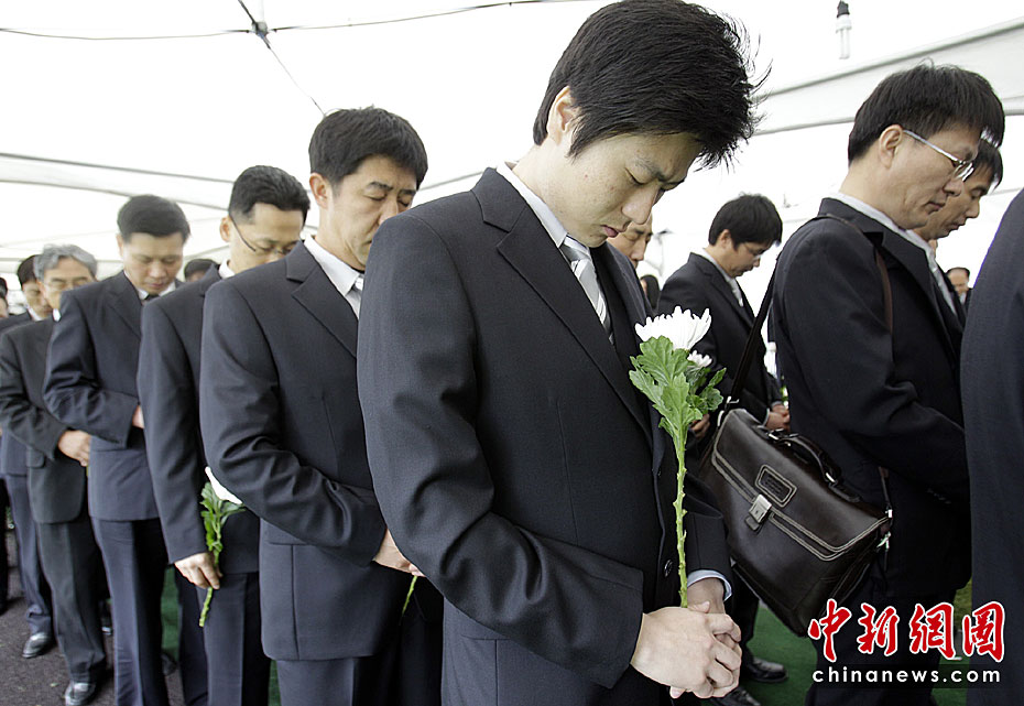 4月29日上午,韓國(guó)“天安”艦遇難官兵遺體告別儀式在平澤海軍第二艦隊(duì)司令部安保公園舉行。韓國(guó)總統(tǒng)李明博攜夫人參加告別儀式。圖片來(lái)源:中國(guó)新聞網(wǎng)