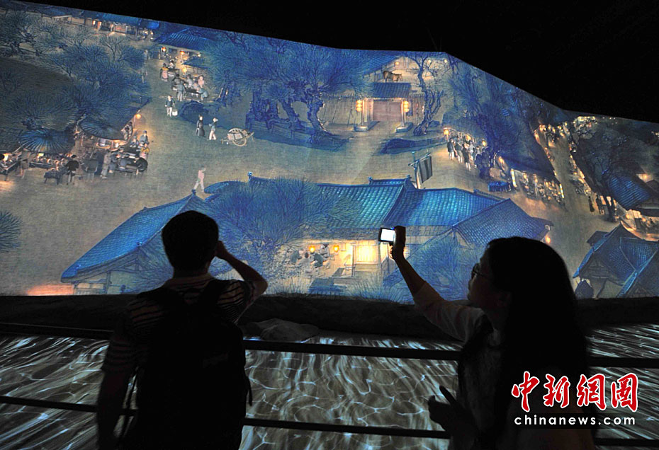 5月2日,中外觀眾依然最熱捧上海世博會(huì)中國館的“鎮(zhèn)館之寶”——巨幅放大電子動(dòng)態(tài)版的北宋畫家張擇端名作《清明上河圖》。此世博版的《清明上河圖》高6.3米,長130余米,約是原圖的30倍,需要12臺(tái)電影級的投影儀同時(shí)工作。整個(gè)活動(dòng)畫面以4分鐘為一個(gè)周期,盡展宋朝盛世的都市日夜風(fēng)情。中新社記者 賈國榮 攝