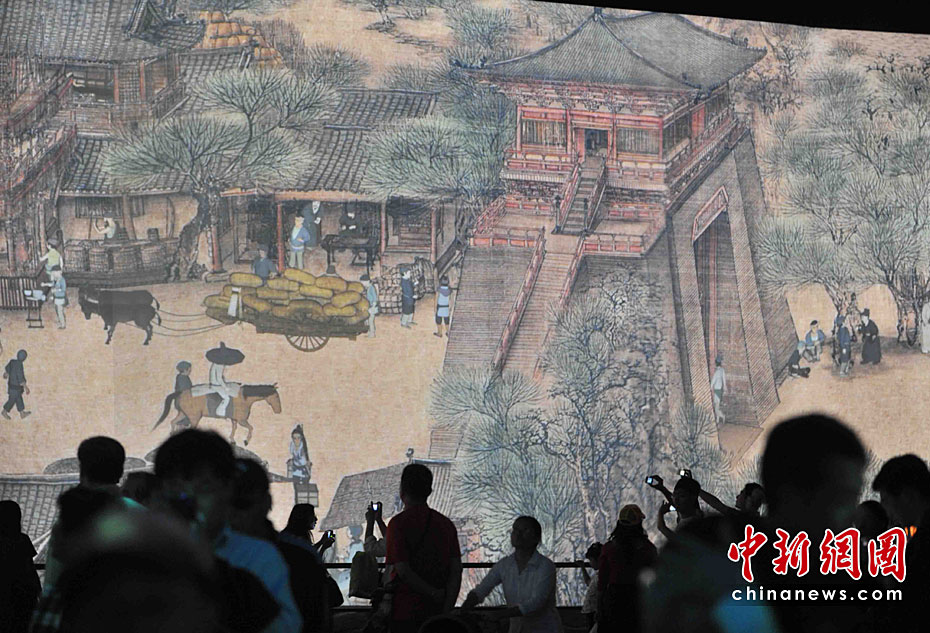 5月2日,中外觀眾依然最熱捧上海世博會中國館的“鎮(zhèn)館之寶”——巨幅放大電子動態(tài)版的北宋畫家張擇端名作《清明上河圖》。此世博版的《清明上河圖》高6.3米,長130余米,約是原圖的30倍,需要12臺電影級的投影儀同時工作。整個活動畫面以4分鐘為一個周期,盡展宋朝盛世的都市日夜風(fēng)情。中新社記者 賈國榮 攝
