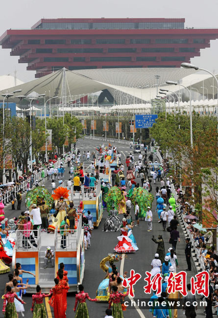 5月4日,世博會(huì)北京周花車巡游隊(duì)伍向中國(guó)館行進(jìn)。當(dāng)日,世博會(huì)北京周開幕。 中新社發(fā) 蘇丹 攝