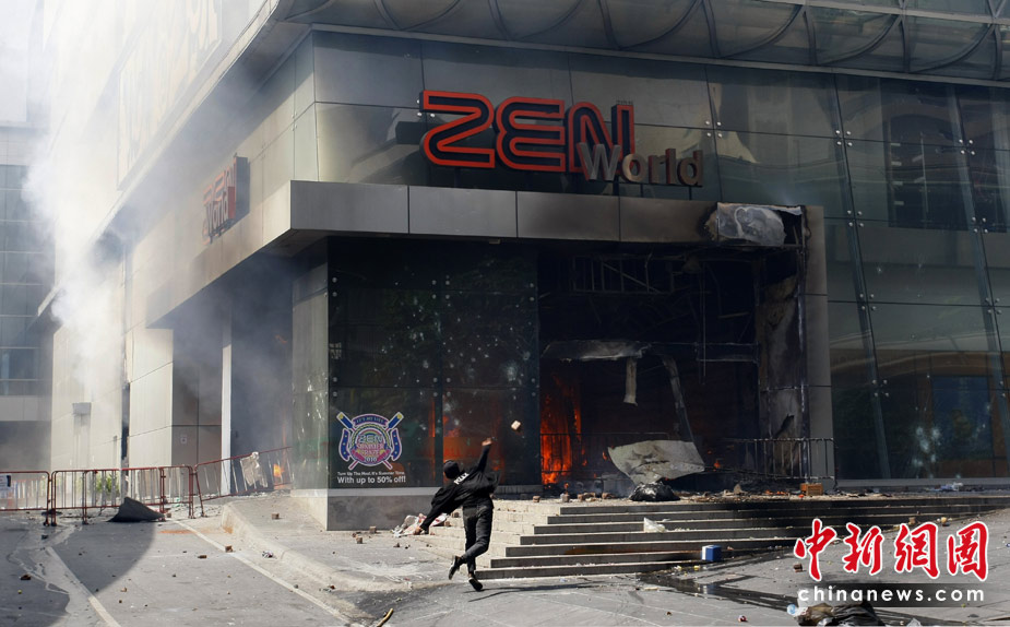 泰國(guó)軍方19日清場(chǎng),希望將陷入內(nèi)戰(zhàn)邊緣的曼谷拯救出來,雖然紅衫軍節(jié)節(jié)敗退,但有激進(jìn)分子未肯罷休,四處放火,電視臺(tái)、股票交易所、電力公司、幾間銀行、商場(chǎng)戲院都遭殃,商場(chǎng)和便利店亦成為搶掠目標(biāo)。據(jù)報(bào)曼谷有27處地方起火,泰國(guó)最大的商場(chǎng)Central World、Siam Square和Siam Paragon三大購(gòu)物中心被縱火,其中Central World燒通頂,據(jù)報(bào)快將倒塌。