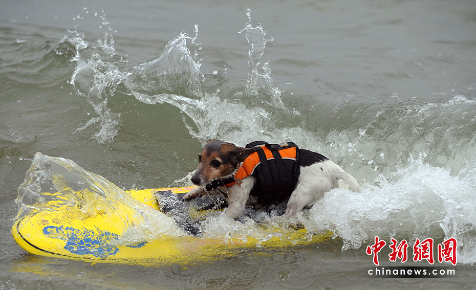5月22日,美國(guó)加利福尼亞州圣迭戈舉行了一場(chǎng)妙趣橫生的狗狗沖浪比賽。圖片來源:中國(guó)新聞網(wǎng)