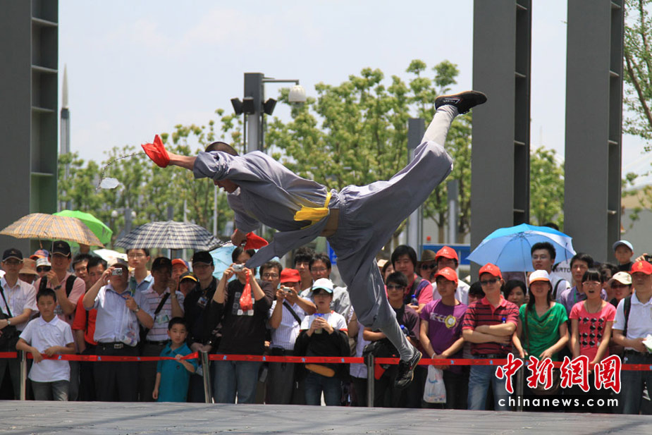 自5月1日開始,上海世博園D片區(qū)綜藝廣場每天都有少林寺功夫展演,受到世博參觀者的熱捧。中新社記者 殷春永攝