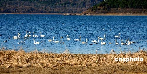 3月13日,一群白天鵝在京郊美麗的懷柔水庫暢游。由于京郊懷柔水清天藍生態(tài)環(huán)境優(yōu)美,吸引了80多只白天鵝在懷柔水庫或潛水覓食或水上嬉鬧或岸邊小息,成了水庫一道迷人的亮麗風景。中新社發(fā) 卜向東 攝