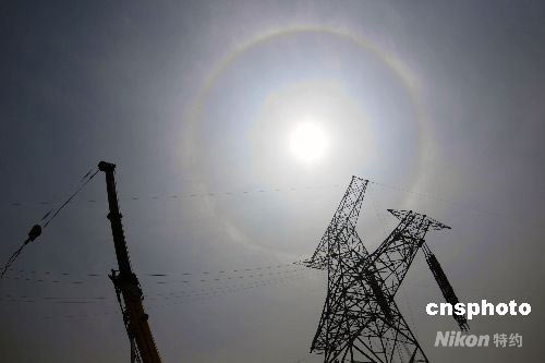 5月10日上午10時許,河南孟州黃河灘區(qū)上空出現(xiàn)日暈奇觀,持續(xù)至11時30分左右散去。日暈是一種比較罕見的天象,多出現(xiàn)在春夏季節(jié)。它是日光通過云層中的冰晶時,經(jīng)折射而形成的光現(xiàn)象,圍繞太陽環(huán)形,呈彩色。中新社發(fā) 楊帆 攝