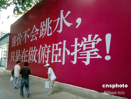 圖為房地產(chǎn)開發(fā)商在南京街頭打出的廣告牌。最近網(wǎng)絡(luò)上流行“我是出來做俯臥撐的”這句話,而南京某開放商也想借機(jī)炒作一把,在南京新街口附近立起一塊廣告牌“房價(jià)不會(huì)跳水,只是在做俯臥撐”。中新社發(fā) willis84 攝