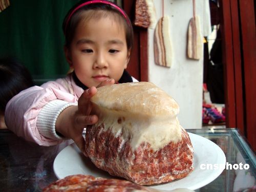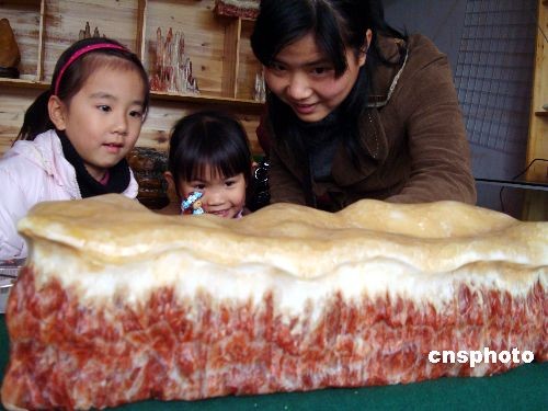 12月13日,在江蘇蘇州古鎮(zhèn)同里一家奇石店內(nèi)一種酷似豬肉的天然石頭吸引了眾多游客。據(jù)悉,這些“豬肉石”是在地質(zhì)運動過程中與其他礦物質(zhì)接觸色化而成,不但長有“肉皮”,而且“瘦肉”和“肥肉”之分,呈現(xiàn)出多層次,十分逼真。中新社發(fā) 王建康 攝