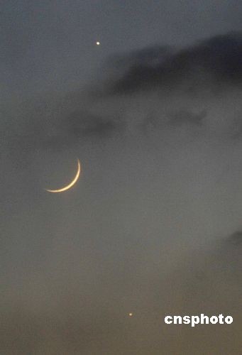 12月29日傍晚,在大連市西南方低空處,彎月的右下方有一顆土黃色星星,距離只1度左右,正在引導(dǎo)著彎月慢慢下沉。這就是2008年度最后一個有趣天象:木星會彎月相約人馬座。中新社發(fā) 劉德斌 攝
