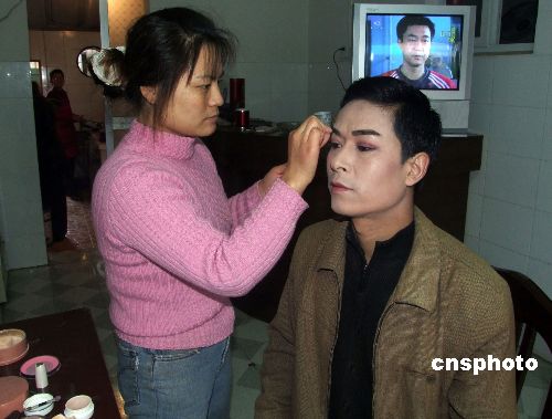 |   2006年11月24日,由安徽巢湖居巢區(qū)夏閣鎮(zhèn)農(nóng)民裴德水、昂小紅自編自導自演自拍的系列電視劇--現(xiàn)代廬劇《苦難中的媽媽》正在該鎮(zhèn)緊張拍攝之中。裴德水、昂小紅分別于1996年和1998年創(chuàng)辦了裴皖、小紅廬劇團,活躍在巢湖市城鄉(xiāng)舞臺上,每年演出200多場次,觀眾達10萬人次。特別是近幾年來,這兩個劇團扎根農(nóng)村,挖掘素材,自編自導自演了大量反映農(nóng)村現(xiàn)實生活、積極向上的劇目,傳播先進文化,歌頌真善美,鞭撻假惡丑,富有教育意義,為廣大群眾所喜聞樂見,傳承、振興和發(fā)揚了地方特色傳統(tǒng)戲曲。中新社發(fā) 李遠波 攝