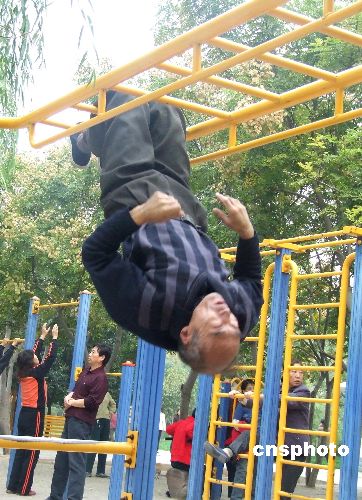 10月19日,九九重陽節(jié),河南三門峽市虢國公園的健身梯上,一位七旬老人雙臂展開,兩腳勾住梯檔以“倒掛金鉤”的方式在不停地打秋千,他的動作讓許多年輕人都不敢嘗試。據(jù)了解,這位老人以前患病臥床不起,經(jīng)過一年的堅持鍛煉,如今身體健康。中新社發(fā) 梁有才 攝