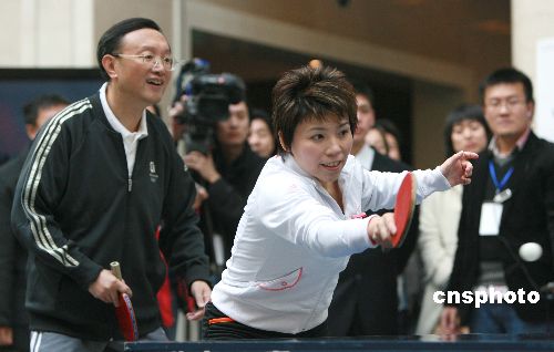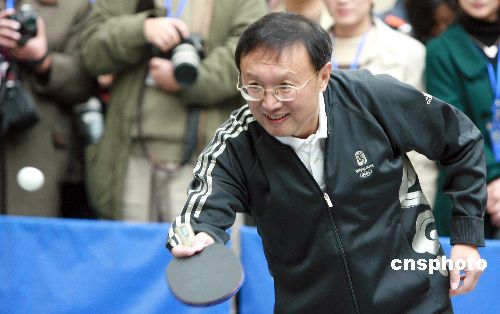 十一月二十五日,中國(guó)外交部在北京舉行主題為“中國(guó)外交與北京奧運(yùn)”的公眾開(kāi)放日活動(dòng)。圖為外交部長(zhǎng)楊潔篪在“趣味乒乓賽”上一展身手。中新社發(fā) 廖文靜 攝
