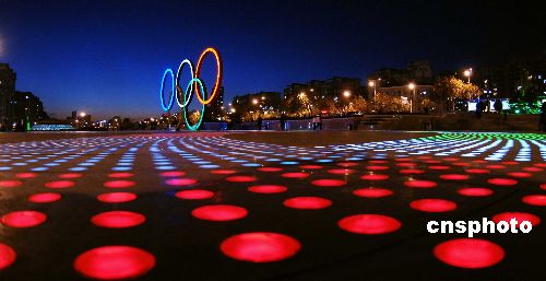 11月27日,大連市奧林匹克廣場流光溢彩。日前,大連市利用高科技對奧林匹克廣場地面進行了改造,在地面新建5個直徑為38米,能變換多種色彩的奧運五環(huán)標志圖案,成為大連市夜間格外壯觀的一景。中新社發(fā) 劉德斌 攝