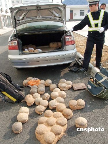 1月5日上午,湖北高速公路交警十二大隊(duì)巡警在樊魏高速公路查獲一輛運(yùn)載有55枚恐龍蛋化石的十堰籍小轎車(chē),據(jù)司機(jī)官某稱(chēng),他正準(zhǔn)備把這些恐龍蛋化石運(yùn)往上海。目前,官某已被高速公路巡警移送到襄樊市公安局襄城分局隆中派出所留置審查。中新社發(fā) 李得榮 攝