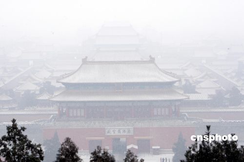 1月17日,北京故宮被白雪覆蓋,京城迎來了2008年的第一場降雪,伴著寒風,小雪很快灑滿了京城的大街小巷。中新社發(fā) 杜洋 攝