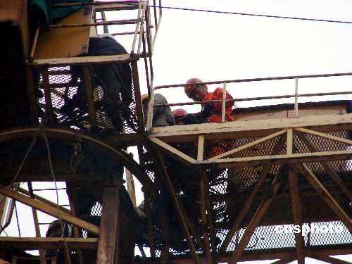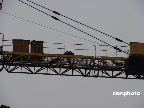 一月十八日,廣西南寧市青秀區(qū)一工地內,一名民工因索要誤工費、醫(yī)藥費未果,爬上六十米高的塔吊揚言自殺。滿足其條件后,該民工因在塔吊上喝了一瓶白酒不能自己下來。中新社發(fā) 胡明軍 攝