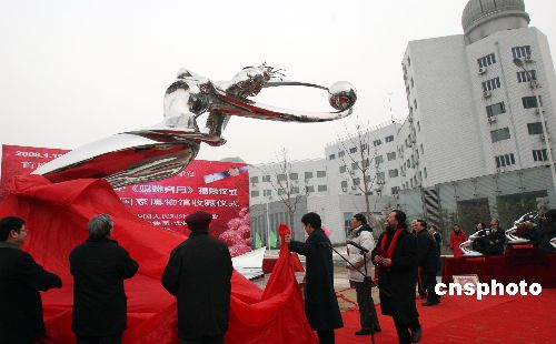 1月19日,中國科學院辦公廳、中國國家博物館、國家天文臺在北京中國科學院奧運村科技園聯合舉行大型雕塑作品“嫦娥奔月”落成揭幕儀式,同時舉行該作品由中國國家博物館永久收藏儀式。雕塑“嫦娥奔月”由中國著名雕塑藝術家遙遠先生創(chuàng)作完成,聯手四川舍得酒業(yè)集團贈送中國科學院。中新社發(fā) 錢興強 攝