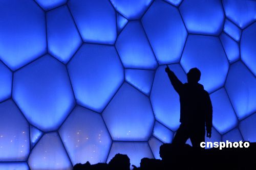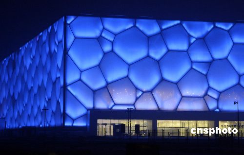 1月19日晚,北京奧運(yùn)工程之一的國(guó)家游泳館(“水立方”)進(jìn)行調(diào)試造型燈光,“水立方”中每個(gè)氣泡被照射上藍(lán)色燈光,令人暢想奧運(yùn)水世界。據(jù)悉,1月31日這里將舉行奧運(yùn)測(cè)試賽,屆時(shí)“水立方”將被照射更多的彩色燈光。 中新社發(fā) 吳芒子 攝