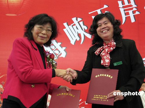 一月二十一日,上海臺商子女學校代理校長劉遼萍(左),與臺北縣秀朗“國小”校長葉瑞芬在上海簽約締結姊妹學校。今后,雙方師生將展開交流和研習活動。據了解,大陸目前有三所專門服務于臺商子女的學校。中新社發(fā) 潘索菲 攝