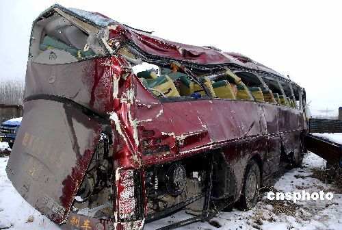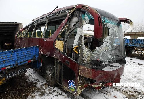 2008年1月20日深夜,一輛從蘇州發(fā)往安徽阜陽的大巴行駛至104國道明光市境內(nèi)時,翻下路邊溝內(nèi),造成7人當場死亡。事故發(fā)生后,當?shù)亟痪⑨t(yī)院等部門火速趕到現(xiàn)場,實施救援。截至記者發(fā)稿時,已有11人死亡,51人不同程度受傷。傷者正在醫(yī)院接受治療,除了兩名重傷者沒有脫離危險外,其他傷者暫時無恙。據(jù)了解,此車核載51人,實載72人。事故原因具體尚在調(diào)查之中。中新社發(fā) 計成軍 攝