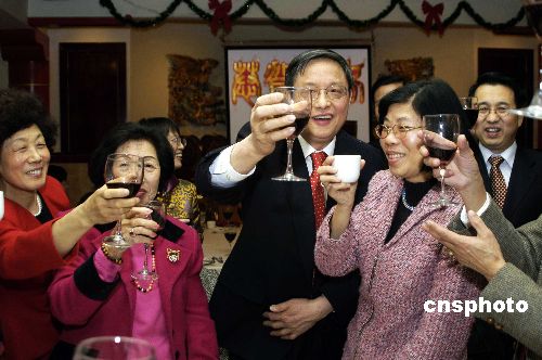 中國(guó)駐美大使周文重(中)及夫人謝淑敏女士(左一)和駐美使館領(lǐng)事部全體外交官1月26日來到華盛頓特區(qū)唐人街,向大華府地區(qū)各僑社領(lǐng)袖拜年。圖為周文重大使向僑領(lǐng)敬酒。中新社發(fā) 邱江波 攝