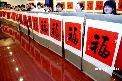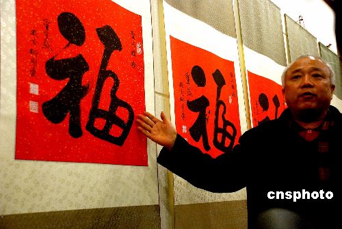 1月27日,唐代著名書(shū)法家柳公權(quán)的后裔柳國(guó)慶正在介紹為圣火傳遞城市贈(zèng)“!钡囊饬x。這些裝裱好的福字是中國(guó)著名書(shū)法家柳國(guó)慶書(shū)寫(xiě)的。近日,將通過(guò)特快專遞在把福字贈(zèng)送到全球奧運(yùn)圣火即將傳遞的130多個(gè)城市的電視臺(tái),并通過(guò)電視傳播將這種中國(guó)特有的藝術(shù)形式為08北京奧運(yùn)圣火成功傳遞祈福。中新社發(fā) 楊慧峰 攝