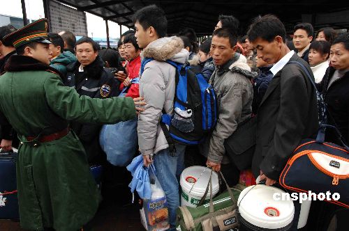 1月29日,位于深圳西站的萬余滯留旅客在寒風(fēng)細(xì)雨中依然期盼踏上返鄉(xiāng)列車,當(dāng)?shù)毓病⑽渚、保安、車站工作人員等現(xiàn)場維持著秩序。受大雪凍雨惡劣天氣影響,中國內(nèi)地的航空、鐵路、公路交通出現(xiàn)多處險(xiǎn)情,滯留旅客回家的路還很艱難遙遠(yuǎn)。中新社發(fā) 陳文 攝