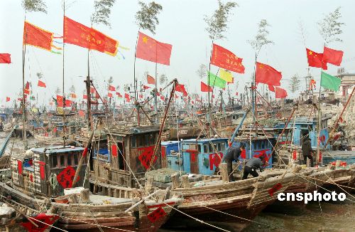 2月5日,在連云港市沿海漁村,漁民們沿襲傳統(tǒng)的漁家過年習(xí)俗。春節(jié)前,漁民在漁船上掛紅旗、貼財(cái)神、放鞭炮,插上寓意“搖錢樹”的毛竹,以祈福納祥,祈求來年新春漁業(yè)豐產(chǎn)豐收。中新社發(fā) 王健民 攝