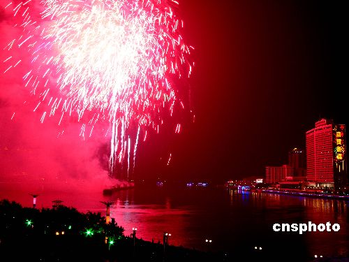 2月7日晚20點30分至21點,2008年廣州市春節(jié)焰火晚會在珠江河段白鵝潭江面舉行。廣州市民及留守外來工一早就前往白鵝潭及珠江岸邊等候欣賞煙花美景。據了解,本次焰火晚會首次采用了全新的情景劇式音樂敘事燃放模式,采用高科技手段,突出嶺南文化。中新社發(fā) 呂明/吳呂明 攝