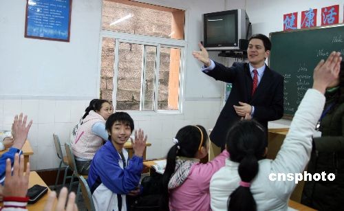 2月27日,英國外交大臣戴維·米利班德與重慶農(nóng)民工子女同上英語課,學(xué)生們爭相與他交流。戴維·米利班德一行于26日抵達(dá)重慶開始為期兩天的訪問,這是他上任以來首次訪華。中新社發(fā) 郭晉嘉 攝