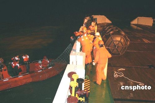 2月27日晚,一艘滿載950噸煤灰的“福順六號(hào)”貨輪在廈門鎮(zhèn)海角附近觸礁擱淺,導(dǎo)致船艙大量進(jìn)水,嚴(yán)重傾斜。經(jīng)過交通部東海救助局“東海救一三一”的全力救助,遇險(xiǎn)船上8名船員全部獲救。圖為救助船施放救生艇把遇險(xiǎn)船員安全轉(zhuǎn)送到“東海救一三一”輪。中新社發(fā) 東海 攝