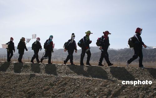 2月28日,新疆哈密伊吾縣八名農(nóng)牧民婦女從302省道50公里處走過。2月27日,新疆哈密伊吾縣八名農(nóng)牧民婦女為慶三八、迎接奧運(yùn)自發(fā)組織徒步行走208公里,此次活動將用八天時間走完全程。她們的行動受到了沿途農(nóng)牧民的支持和好評。中新社發(fā) 普拉提 攝