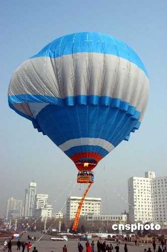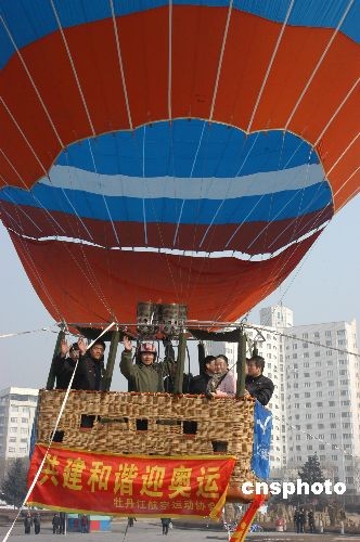 3月12日,黑龍江省牡丹江市航空協(xié)會(huì)舉辦的迎奧運(yùn)熱氣球升空活動(dòng)在江濱廣場(chǎng)舉行。一只體積達(dá)8000立方米、載荷2.2噸、亞洲最大的熱氣球在廣場(chǎng)升起,“共建和諧奧運(yùn)”的條幅代表了航空愛(ài)好者的心聲。此次活動(dòng)吸引了許多市民前來(lái)觀看。中新社發(fā) 張克非 攝