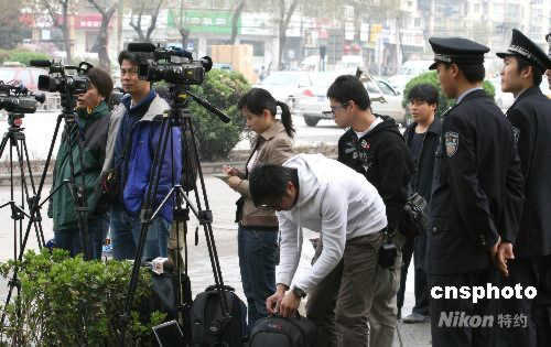 4月11日,天津市第二中級人民法院開庭對原中共上海市委書記陳良宇做一審判決。清晨開始,就有包括香港媒體在內的多家媒體記者聚集在天津二中院附近進行跟蹤報道。中新社發(fā) 齊天 攝