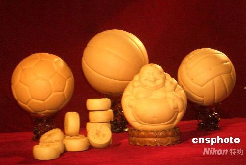 中新網(wǎng)北京四月十五日電 (王歡)中國農(nóng)民用先進(jìn)科技培育出的世界上獨一無二的足、籃、排三大球造型葫蘆,今天在北京國際會議中心亮相,他們的培育者查泰山將這些“葫蘆”工藝品贈送給中國體育博物館,表達(dá)了中國億萬農(nóng)民對北京奧運會的祝福和期盼。
