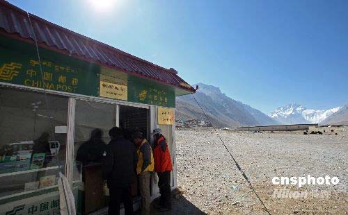 4月29日,位于西藏珠峰大本營(yíng)絨布新聞中心的中國(guó)珠穆朗瑪峰臨時(shí)郵政局,不少采訪北京奧運(yùn)會(huì)火炬接力珠峰展示活動(dòng)的中外記者前來(lái)購(gòu)買(mǎi)具有珠峰特色的北京奧運(yùn)會(huì)紀(jì)念品。中新社發(fā) 盛佳鵬 攝