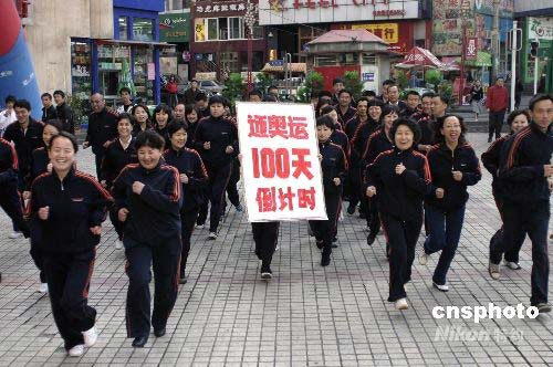 4月29日,新疆電影公司50余名職工手舉“迎奧運(yùn)100天倒計(jì)時(shí)”牌匾,在新疆烏魯木齊市街頭舉行長(zhǎng)跑活動(dòng)。同時(shí),為期5天的趣味運(yùn)動(dòng)會(huì)也拉開(kāi)帷幕,其中包括長(zhǎng)跑、踩氣球、乒乓球等項(xiàng)目,為即將到來(lái)的北京奧運(yùn)會(huì)吶喊助威。中新社發(fā) 劉新 攝