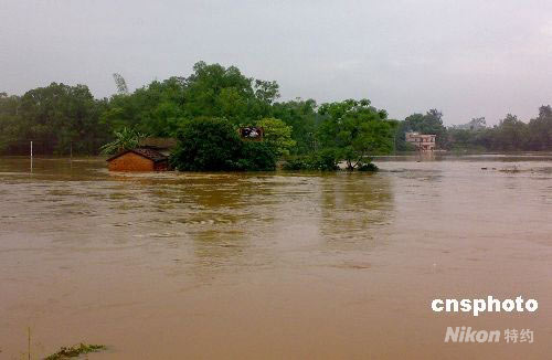 五月四日,廣西部分沿海城市突降暴雨,大雨滂沱數(shù)小時,降雨量竟達全年平均降雨量的五分之一,造成部分地區(qū)出現(xiàn)水澇。圖為廣西北海市合浦縣白沙鎮(zhèn)五里牌村被洪水淹沒的房屋。中新社發(fā) 羅毅強 攝