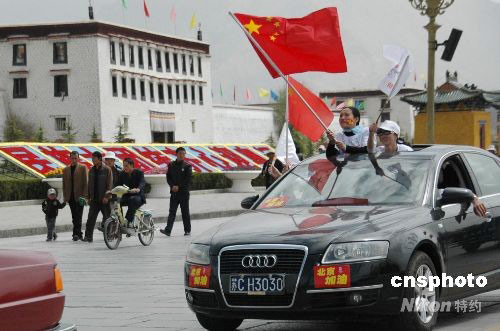 圖:網(wǎng)友自發(fā)組織的奧運(yùn)助威車隊(duì)駛過(guò)拉薩布達(dá)拉宮